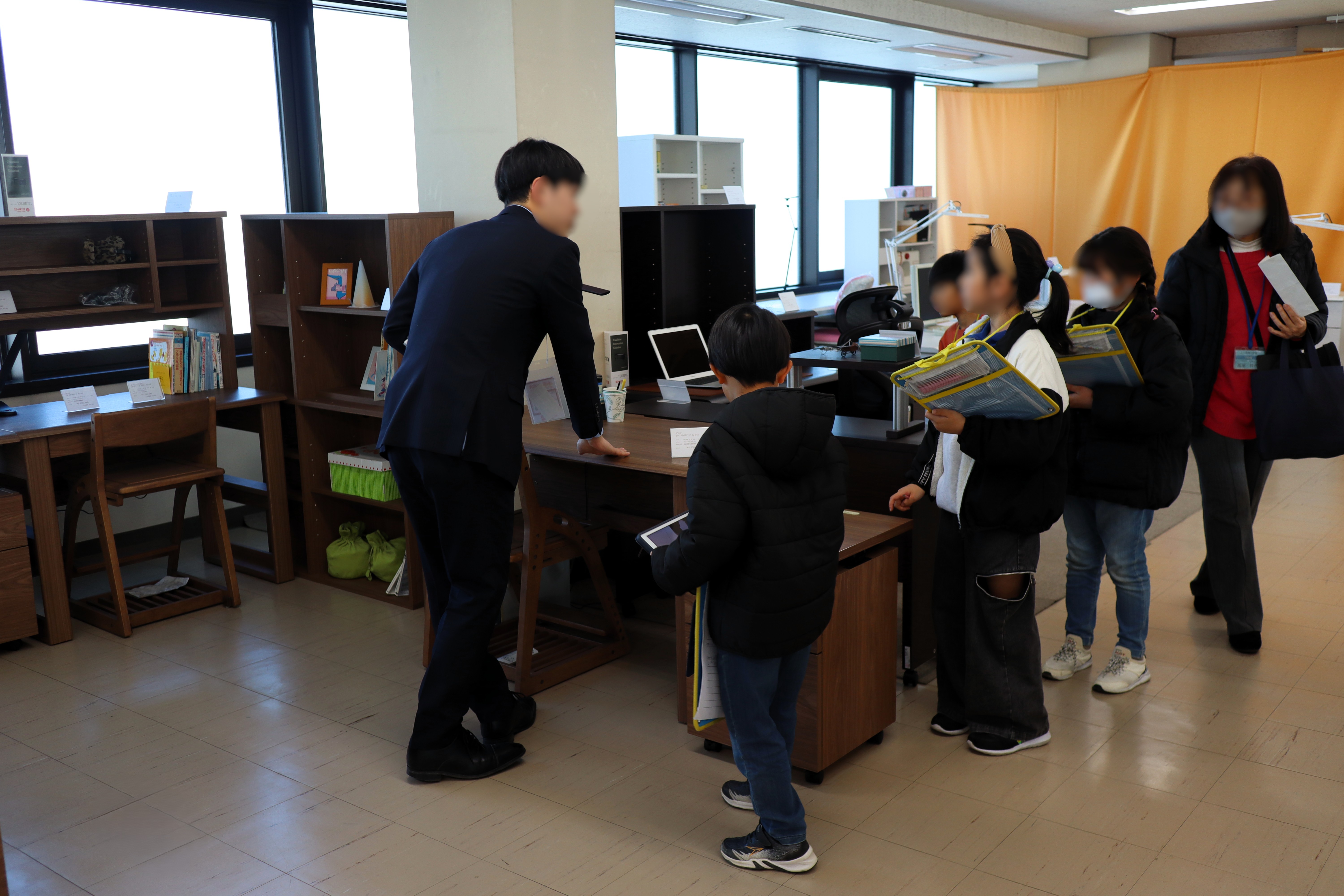 本棚や机、システムベッドなどがたくさん並ぶショールームに子どもたちは興味津々でした。